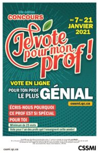 Pour souligner la Semaine des enseignants et des enseignantes du Québec, le CSSMI lance la 10e édition du concours « Je vote pour mon prof le plus génial! ». Tous les élèves, jeunes et adultes, sont invités à voter en ligne pour ce prof qui est marquant dans leur quotidien (ce prof doit faire partie de ceux qui lui enseignent cette année). Par le biais d’un texte (ou par un dessin chez les élèves du préscolaire ou de la 1re année), chaque élève doit exprimer pourquoi son prof est si spécial pour lui. Les élèves ont jusqu’au 21 janvier 2021 pour proposer une candidature!